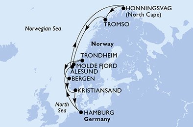 - Hamburg -> At Sea -> Alesund Norway -> At Sea -> Honningsvag (North Cape) Norway -> Honningsvag (North Cape) Norway -> Tromso Norway -> At Sea -> Molde Norway -> Trondheim Norway -> Bergen Norway -> Kristiansand Norway -> At Sea -> Hamburg Germany